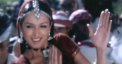 Urdu and Hindi, though, aren't that different. In theory, Urdu is more Persianized and Hindi is more Sanskritized, and literary Urdu definitely is that way, and the government and media speak Sanskritized Hindi. But really, most people speak Hindi that's more or less Persified depending on their community and fairly heavily influenced by English, but never as Sanskritized as Hindi on the TV news. There are differences in dialect, like how Urdu speakers will say "sar" for the English "head" and Hindi speakers will say "sir," but most people will prefer to say "university" instead of "vishwavidhyalya," which is what you're supposed to say in "real" Hindi. And there are regional dialects, too. Many Northerners will pronounce "vegetables" as "sabzi," which is the way you say it in Farsi and Urdu, but some in areas like Uttar Pradesh and Delhi will say "sabji," because "z" is one of the sounds that Hindi doesn't have. Given that it's not always obvious what the difference is between Urdu and Hindi, it's actually more accurate to say that Bollywood movies are in Urdu, mostly because it's considered more beautiful than Hindi. Religion, which is the ostensible difference between the dialects, is a tricky thing in movies, because nowadays, moviemakers often try not to offend anyone - although other times, they're complete demagogues. Sometimes people seem to switch religions during the course of a movie, but even when a character is obviously Hindu, she'll often speak Urdu, or especially sing it, for beauty. Also, my friend Daniel, who helped me with this page, told me that after Independence, when the film industry was starting, "Muslims were those who wrote poetry and songs and went to courtesans, and these courtly cultured people shifted to film after the nawaabs lost money. And the langauge of education was Urdu, so the screenwriters all spoke and had their entire education in Urdu. Therefore, it was only natural for them to write in Urdu. Also, a 'respectable' Hindu would not act in a film."
